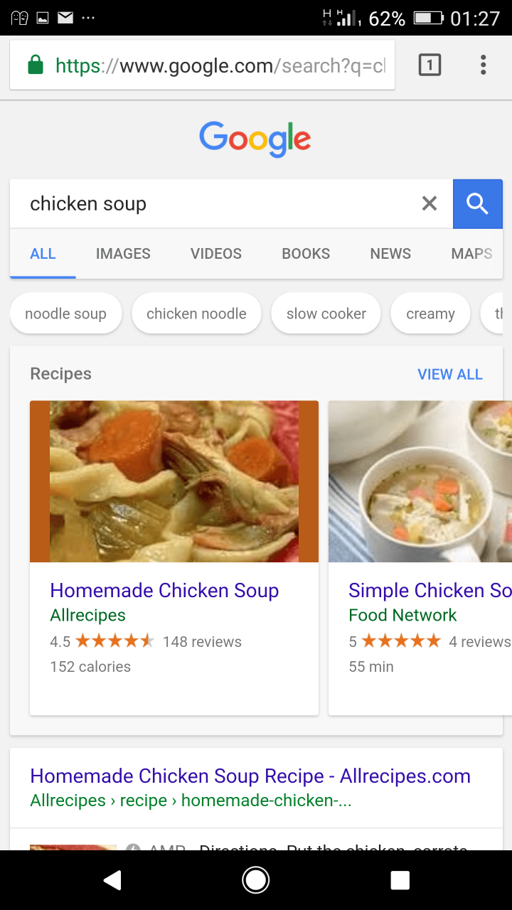 Google is even giving you a few extra filters for those recipe results — under the search bar, you’ll get more suggestions that you can use to refine your search. For example, when we searched for “chicken soup,” there were links to “noodle soup” “chicken noodle,” and so on. You’ll also get a “view all” link, which will take you to a more detailed view of the recipes Google is suggesting.