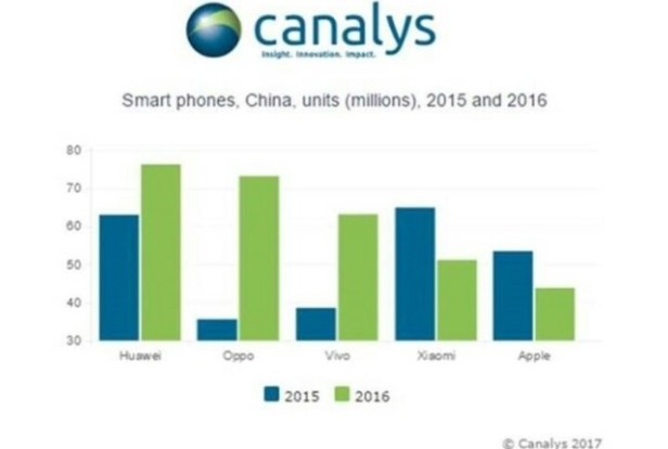 Research company Canalys released data which showed that Apple shipped 43.8 million iPhones in China last year which represented an 18.2 percent decline year-over-year. This is what caused the iPhone to slide down to the fifth position in the country’s smartphone market. Apple was overtaken by Xiaomi even though that company saw its shipments fall 21 percent to 51.4 million units.
