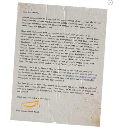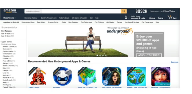 The larger idea with the program was to lure consumers over to Amazon’s own hardware, the Kindle Fire HD and Fire HDX tablets, where the Underground apps were available through Amazon’s built-in Android app store. However, the company also made its Underground apps available to other Android devices through a separate download of an Underground mobile app.