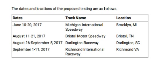 Here’s the schedule for the upcoming Google NASCAR tests, per the filing: